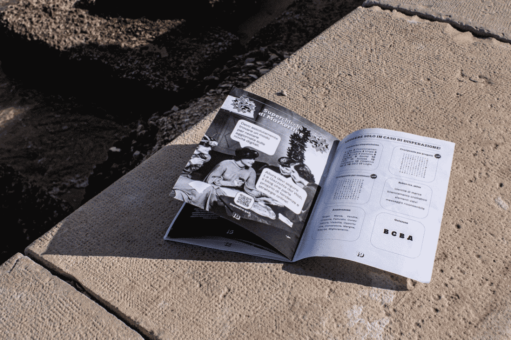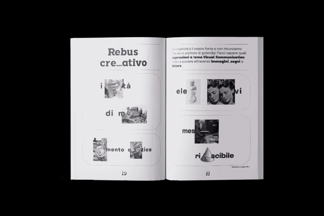 Si tratta di progetto che riproduce i canoni visivi e linguistici dei periodici enigmistici. Infatti, i giochi, i quesiti e persino le rubriche, rivisitate in chiave marketing, sono ispirate a questo affascinante immaginario rétro de La Settimana Enigmistica.
